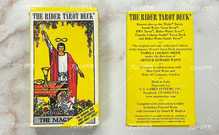 こちらが、Arthur Edward Waite(アーサー・エドワード・ウェイト)とPamela Colman Smith(パメラ・コールマン・スミス)によって作られたカード『THE RIDER TAROT DECK』です。