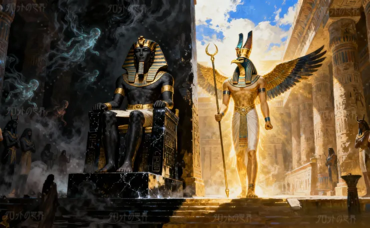 最終的にホルスが勝利し、正統な王位を継ぎます。こうして秩序は回復され、オシリスは冥界の王、ホルスは地上の王として、それぞれの役割を担うことになったのです。